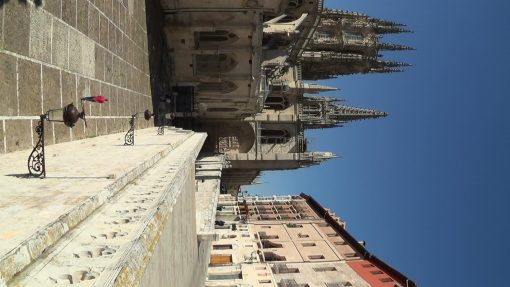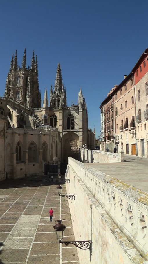 The Catedral de Santa Maria de Burgos, seen from Calle de Fernan Gonzalez. UNESCO World Cultural Heritage Site. Morning life. The Albergue Municipal for pilgrims on the Camino de Santiago (St. James Trail) is right behind the camera.