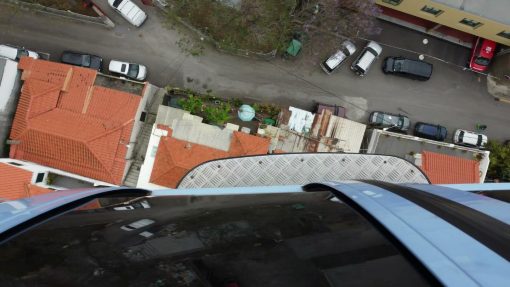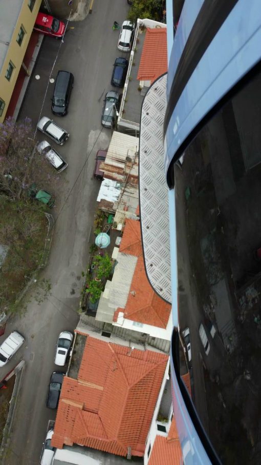 Vertical view from the gondola down to the roofs. The scenery passes top-down.