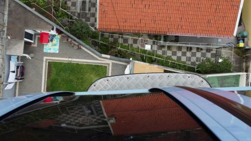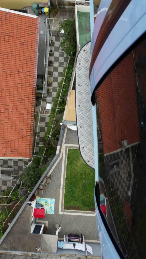 Vertical view from the gondola down to the roofs. The scenery passes top-down.