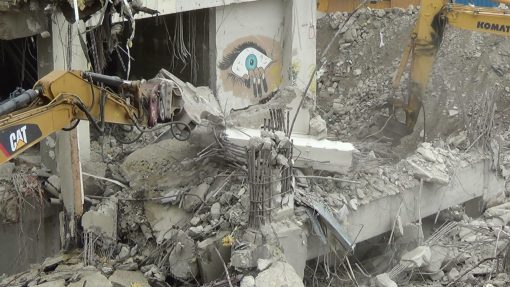 Building demolition by demolition shear.
