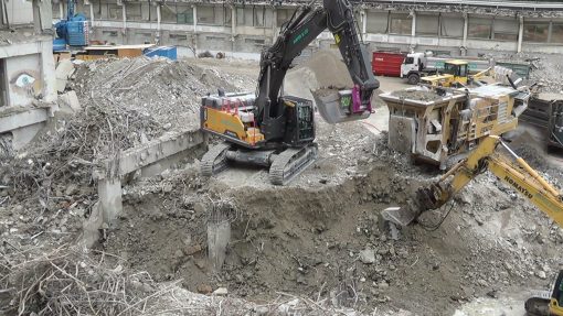 Building demolition site, rubble processing.