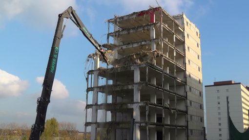 Building demolition by demolition shear on the long arm.