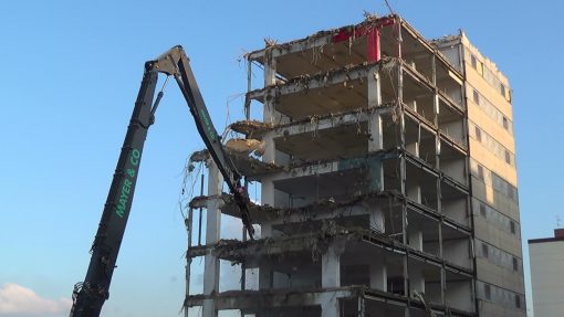 Building demolition works by demolition shear.