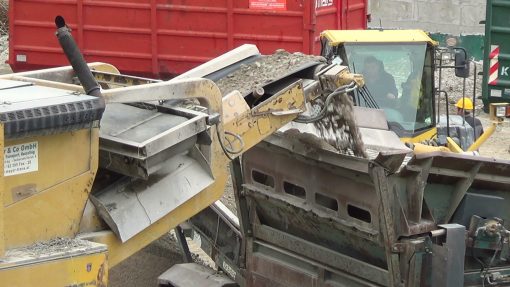Building demolition, on site rubble crusher and screener. This video is closer to the scene than the video no. 50436.