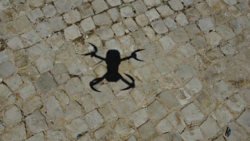 Shadow of a hovering drone on cobblestone pavement.