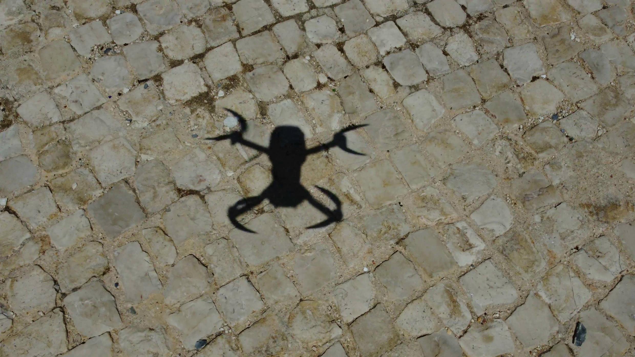 Shadow of a hovering drone on cobblestone pavement, filmed by the drone camera. Upright size.