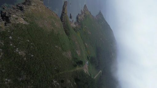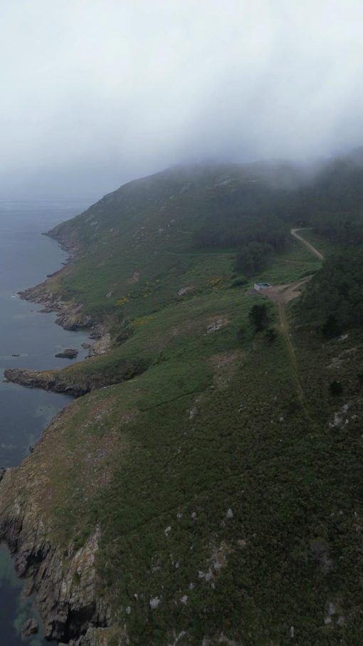 Costa da morte in Galicia, the lighthouse of Finisterre stands invisible in the distance. This is a flight forward.