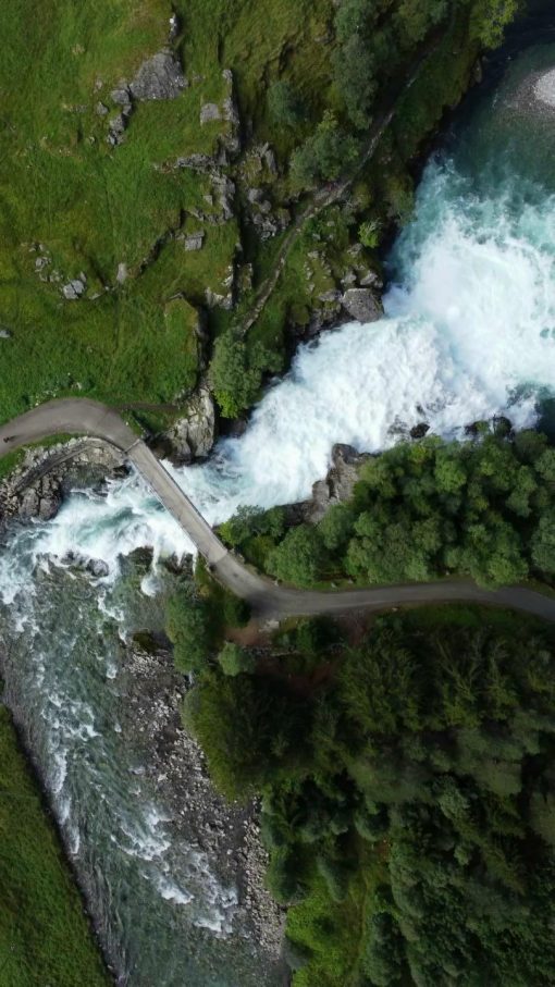 Valle de Flåm, Noruega. Flåmselvi cerca de Myrdal. Día soleado de verano. Este es un vuelo hacia atrás e inclinado hacia abajo. Tamaño vertical.