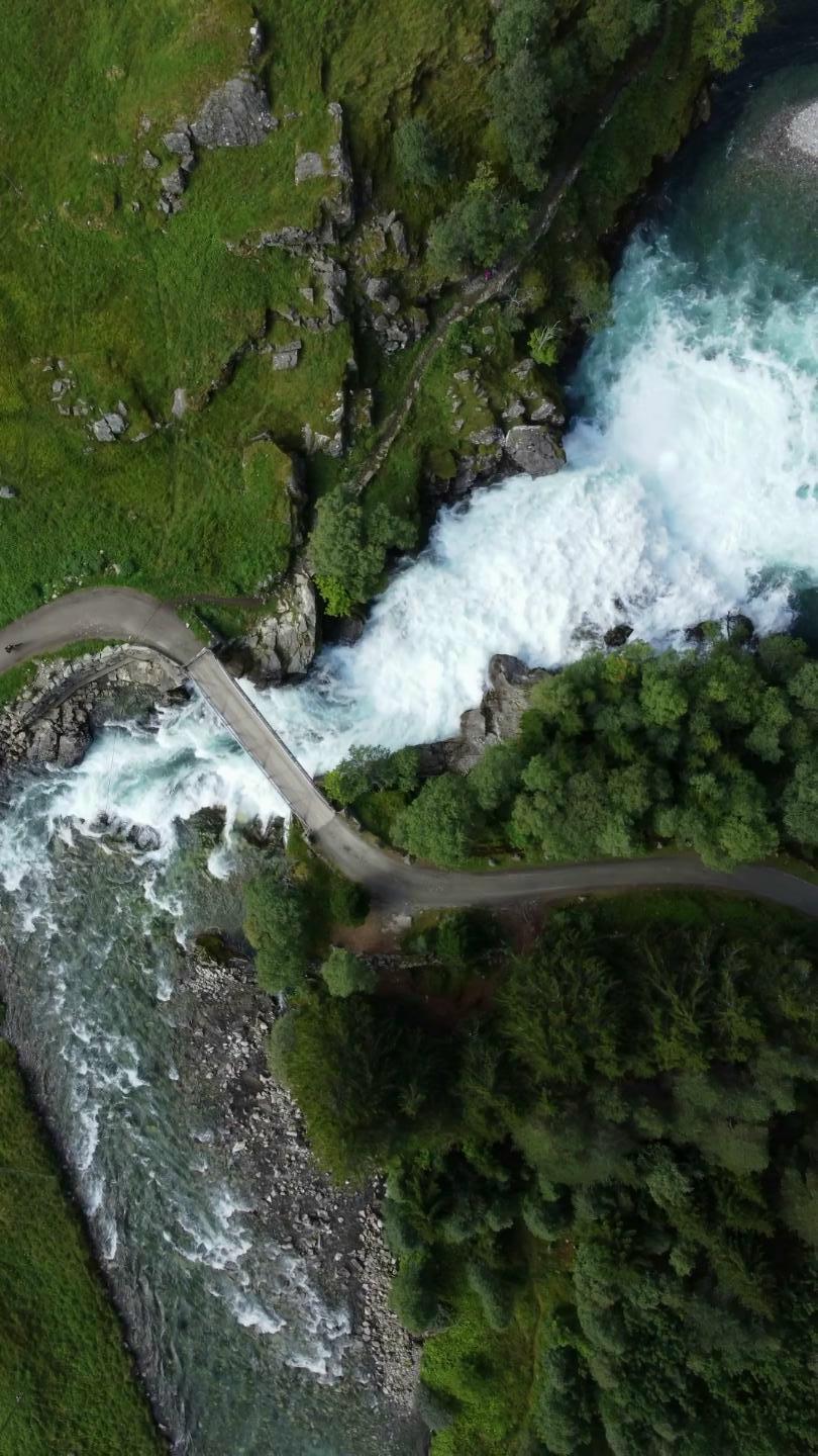 挪威弗洛姆山谷。米达尔附近的弗洛姆塞尔维。阳光明媚的夏日。这是向后飞行并向下倾斜。直立尺寸。