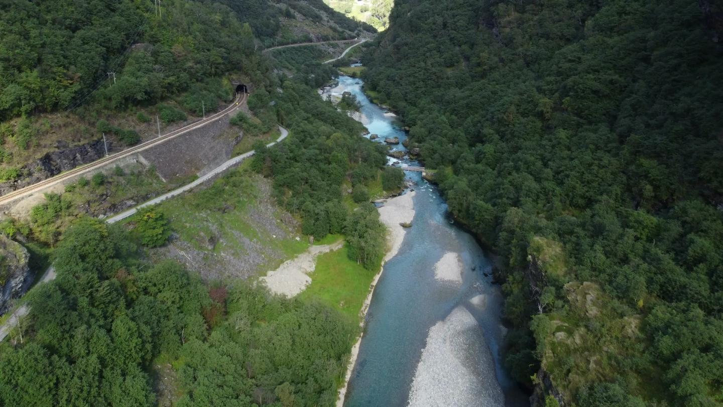 Flåm river, Rallarvegen and the Flåmsbana tracks. This is a flight forward.