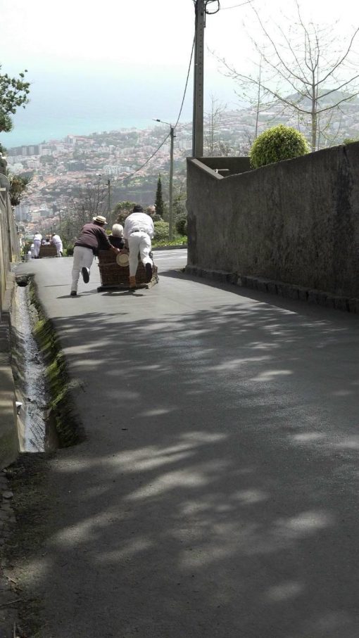View from Monte down to Funchal, “Carreiros” with their wicker toboggans pass by.