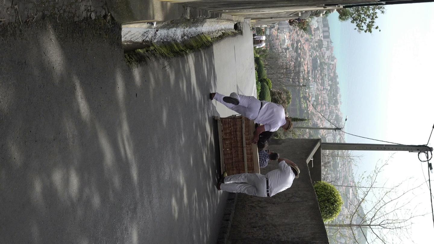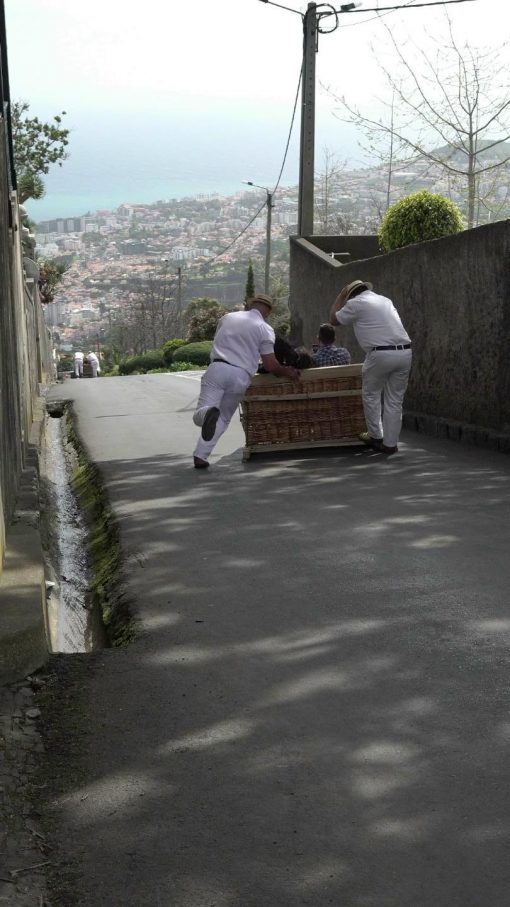 View from Monte down to Funchal, “Carreiros” with their wicker toboggans pass by.