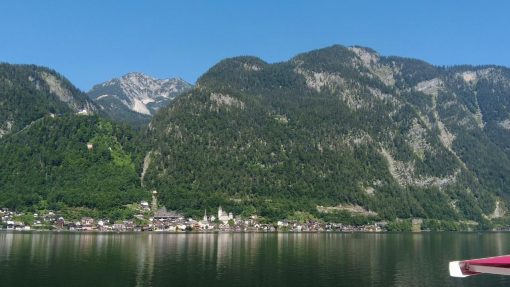 View from the tour boat. On the left hand side the tracks of the funicular and the mountain restaurant. Village and region are UNESCO World Heritage Site.
