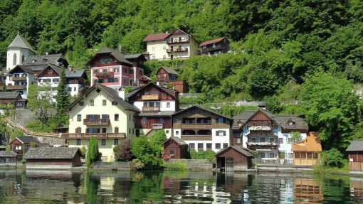 View from the ship. The village passes from the left to the right. Village and region are UNESCO World Heritage Site.
