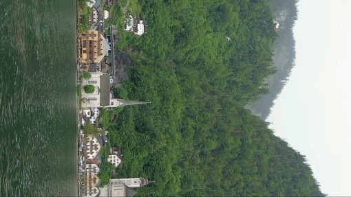 The village seen from the lake. On the left hand side the mountain restaurant. Village and region are UNESCO World Heritage Site.