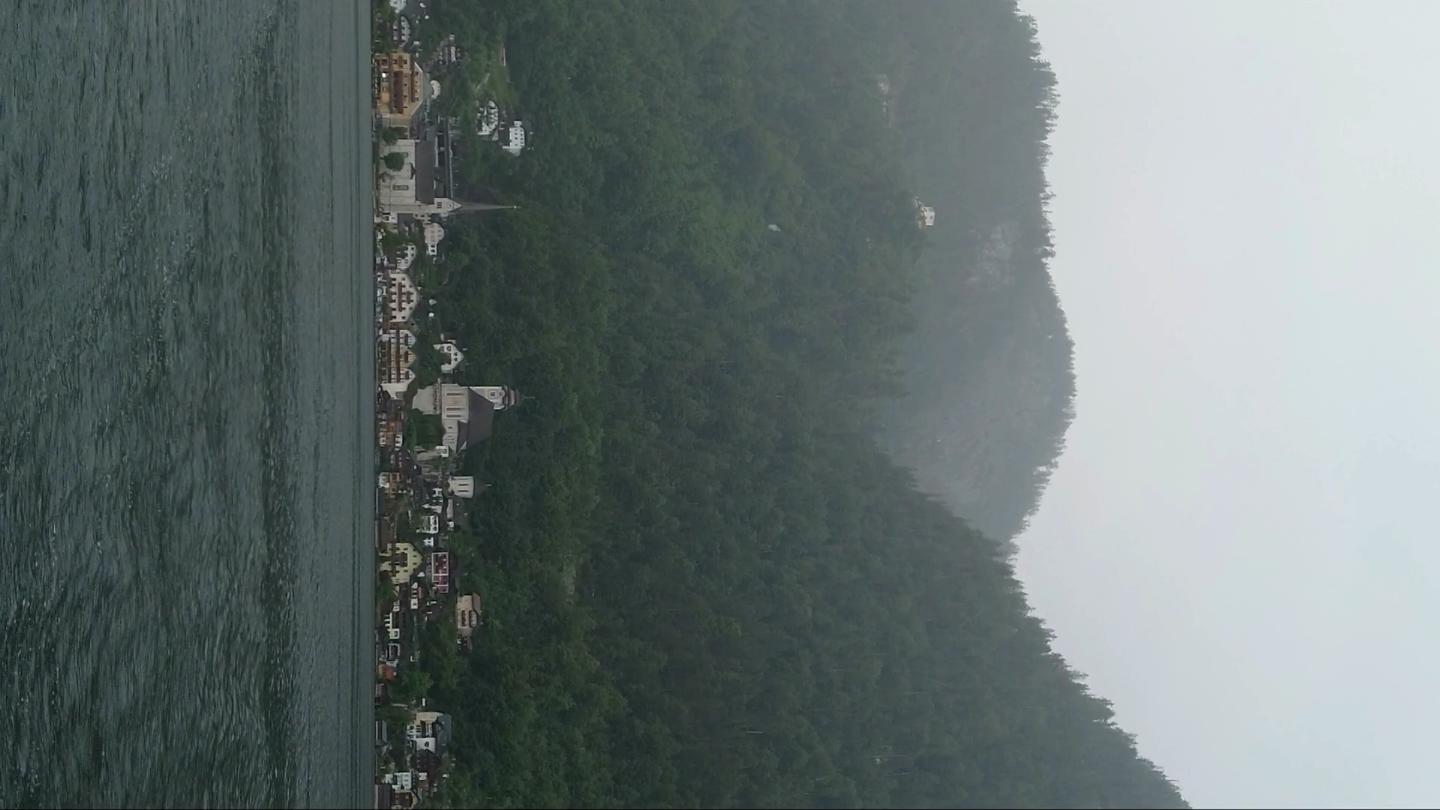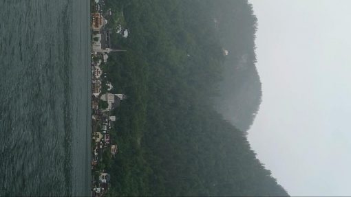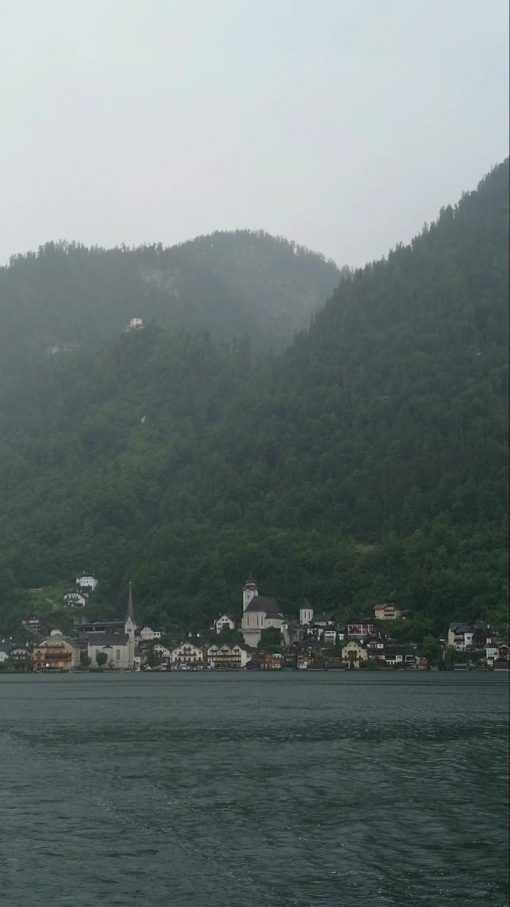The village seen from the lake. Rain set in. Village and region are UNESCO World Heritage Site.