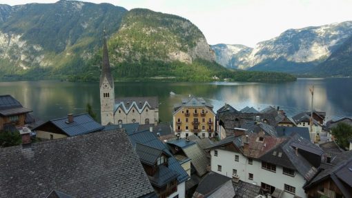 Hallstatt and lake, seen from the street behind the village. This is a panorama from the right to the left. Village and region are UNESCO World Heritage Site.