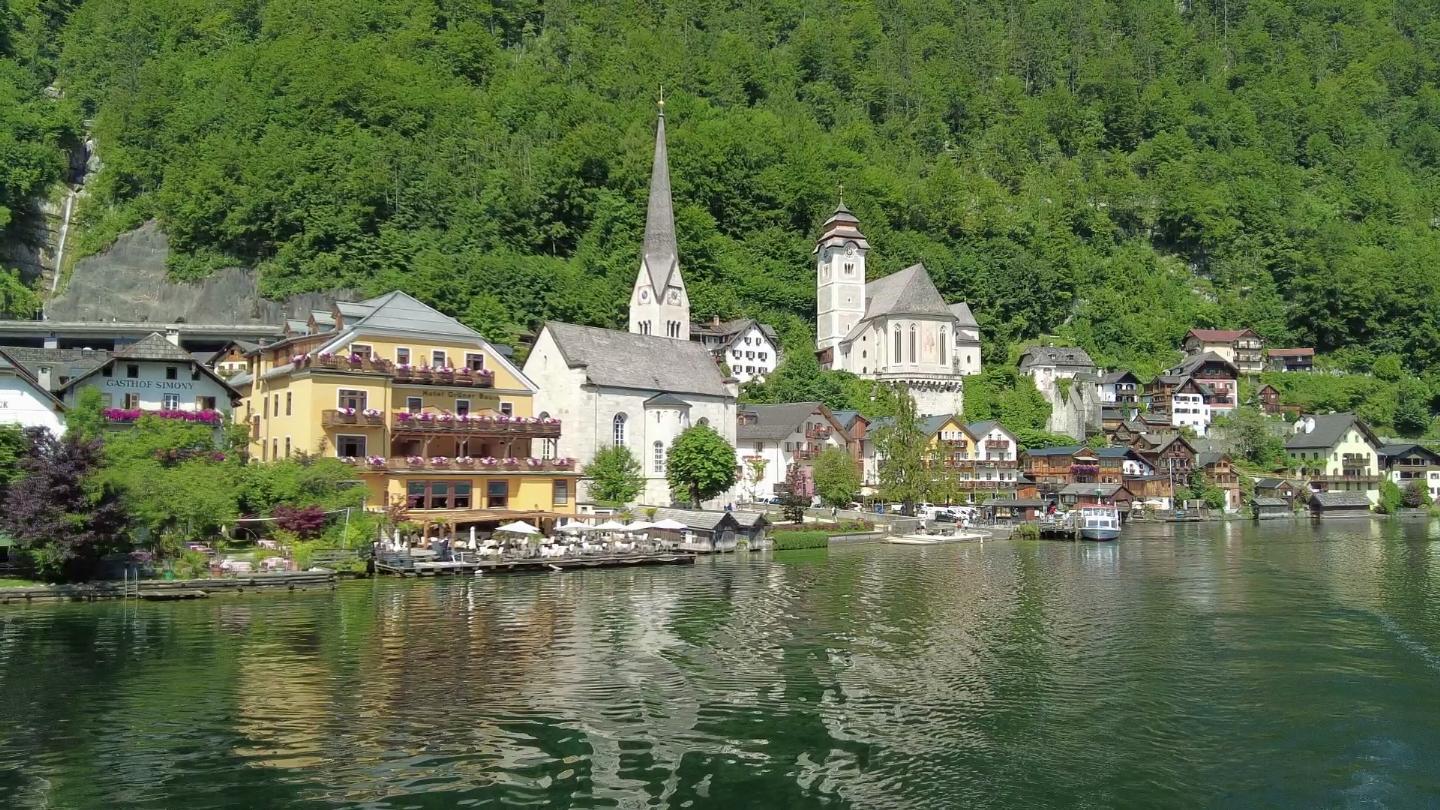 The ferry from the train station approaches the Hallstatt pier. Village and region are UNESCO World Heritage Site.