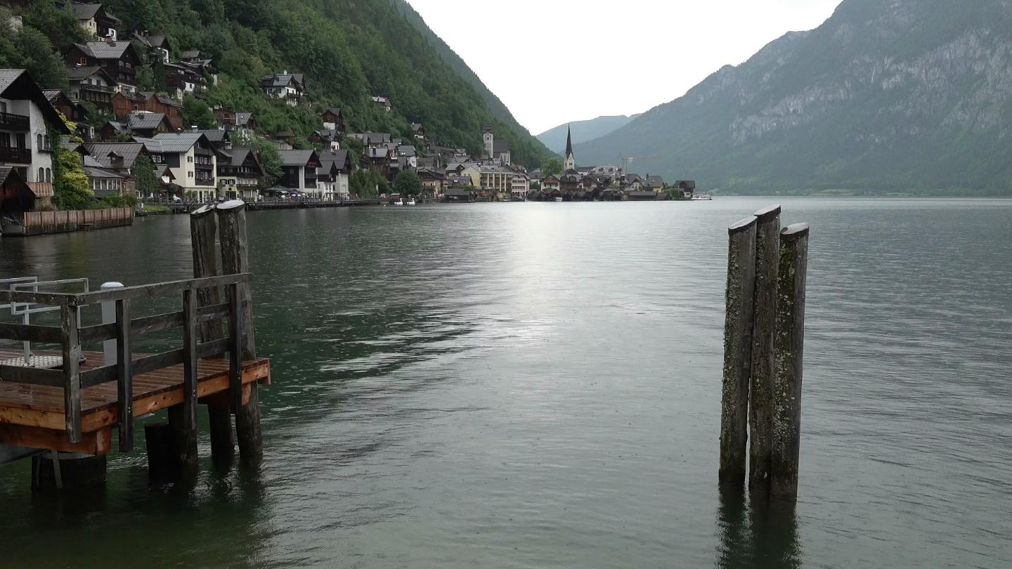 Heavy clouds and rain over Hallstatt and Hallstättersee (Lake Hallstatt). The region is UNESCO World Heritage Site.