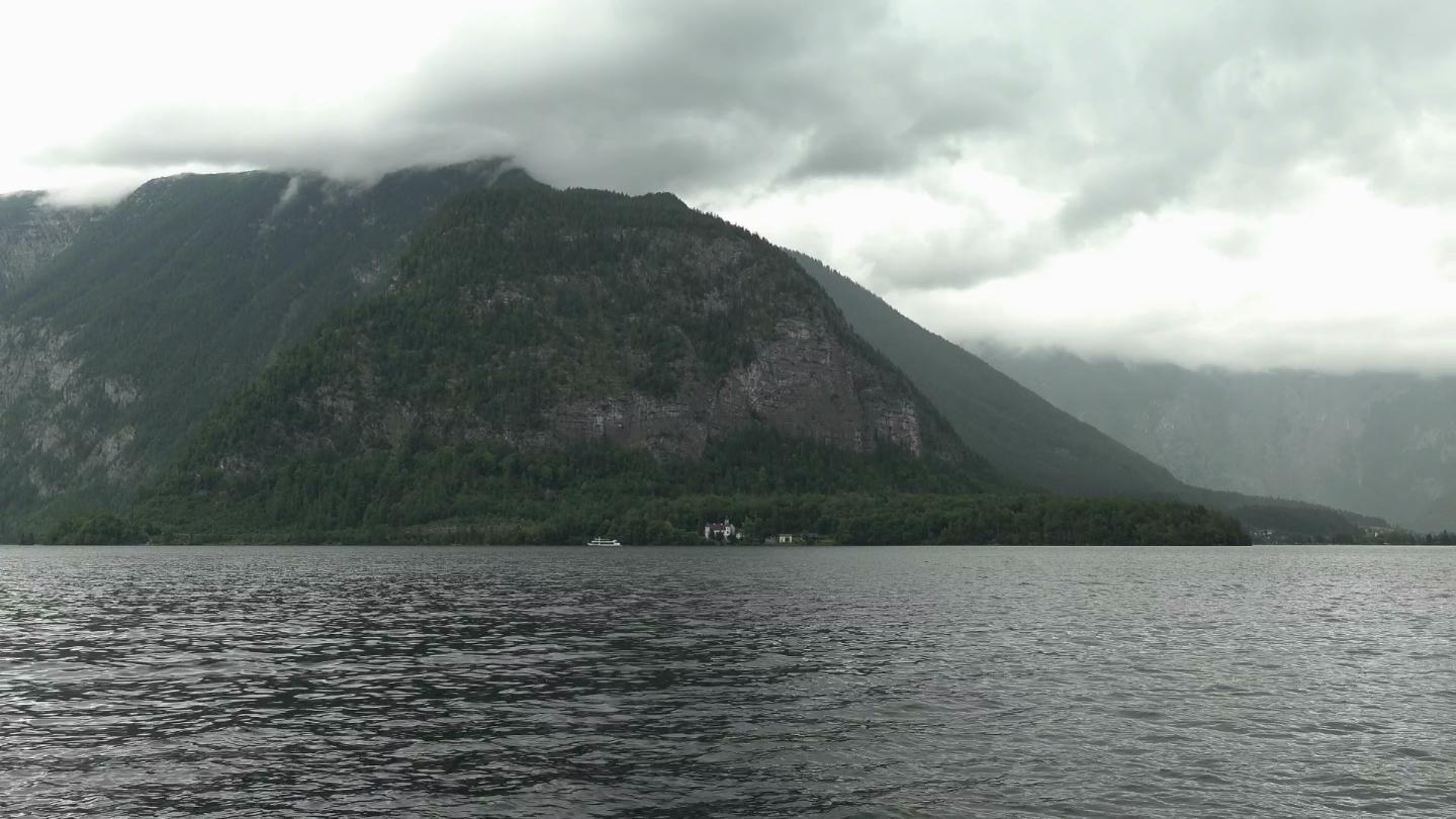 Heavy clouds over Hallstatt and Hallstättersee (Lake Hallstatt). The region is UNESCO World Heritage Site. This is a panorama from the left (Hallstatt) to the right (Obertraun).