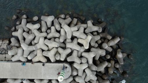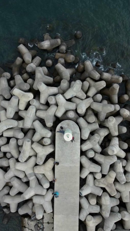 Sea, mole and light tower. The scenery moves from the left to the right.