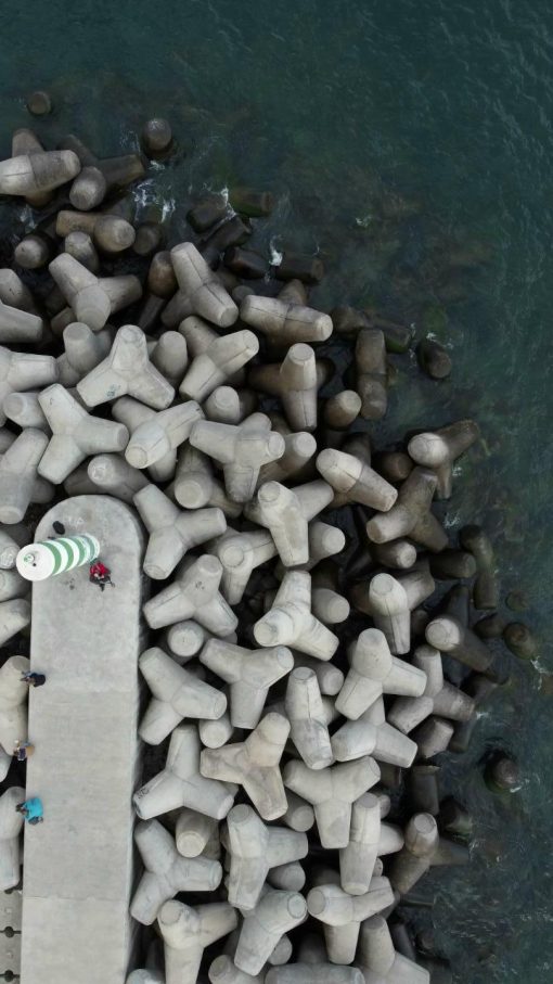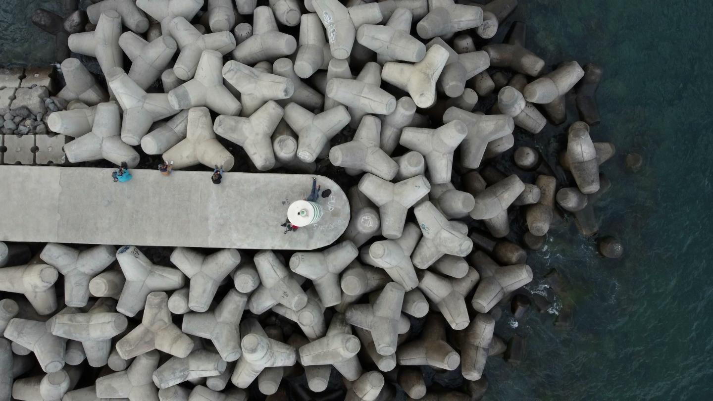 Sea, mole and light tower. The scenery moves from the right to the left.