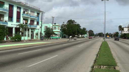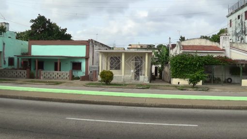 Street life in the district Playa, Avenida 31. The turquise/brown building behind the porch was (according to my travel guide) the former local social club of the ward Buena Vista. This is a panorama from the left to the right, from the house to the street traffic.