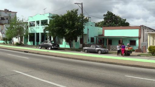 Street life in the district Playa, Avenida 31. The turquise/brown building behind the porch was (says the travel guide) the former local social club of the ward Buena Vista. This is a panorama from the right to the left, from the house to the street.