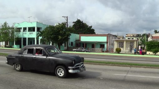 Street life in the district Playa, Avenida 31. The turquise/brown building behind the porch was the former local social club of the ward Buena Vista. This is a panorama from the left to the right, seen from the other side of the street.
