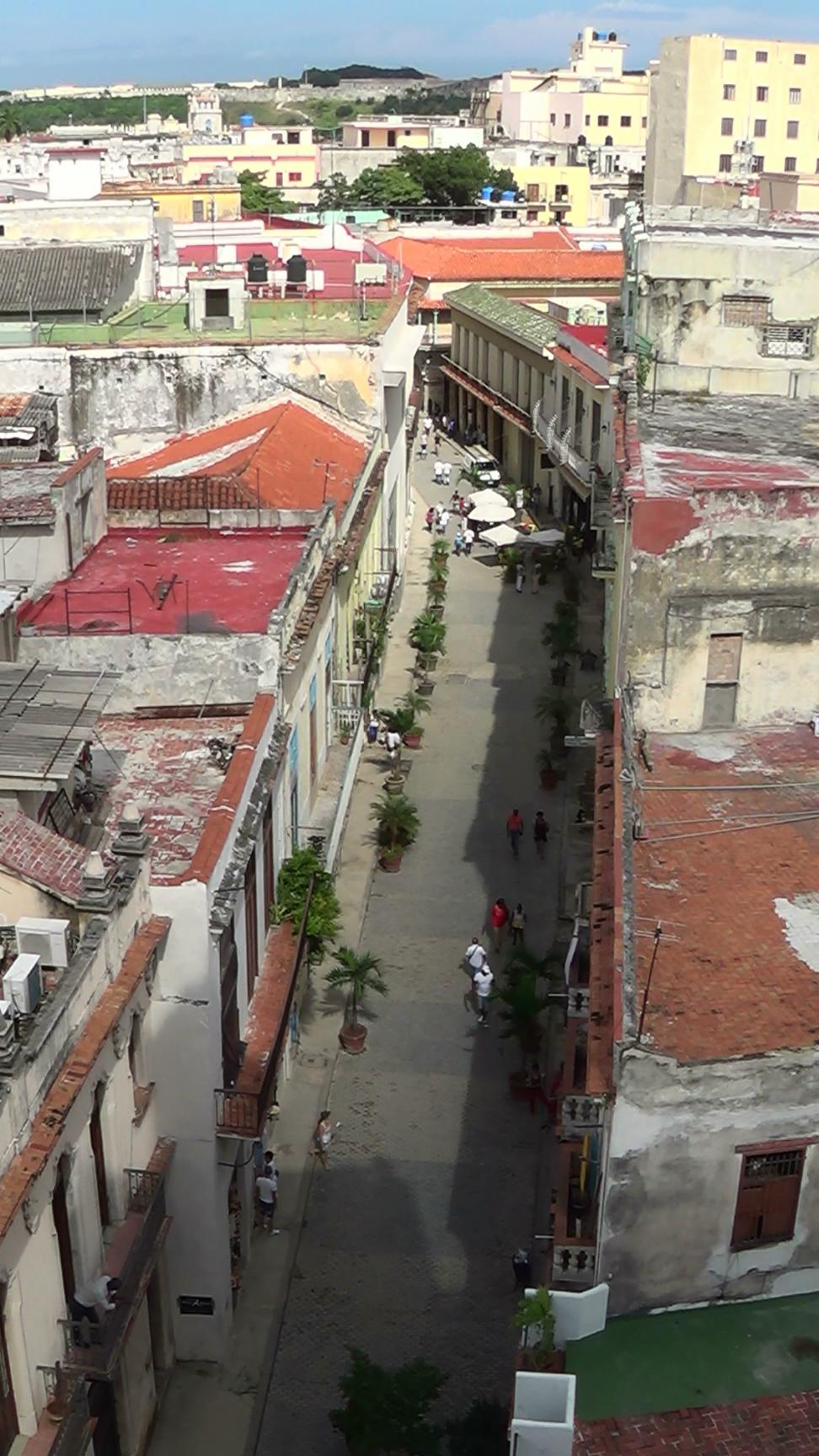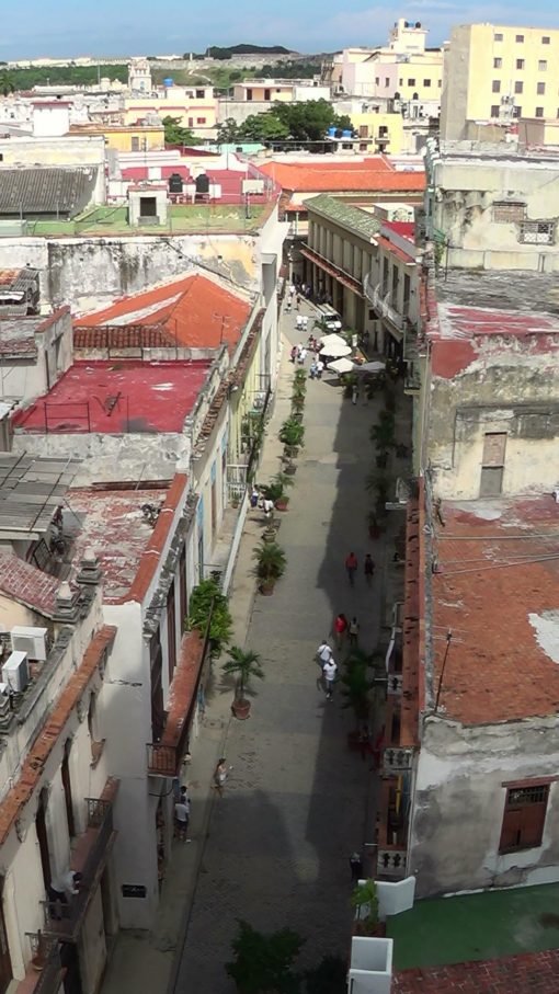 A view from the Edificio Gomez Vila (the building with the “Camera Oscura” on the roof) down to Calle Mercaderes. The old town of Havanna (La Habana Vieja) is UNESCO World Cultural Heritage Site.