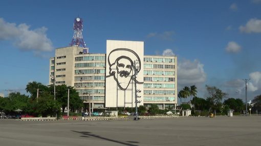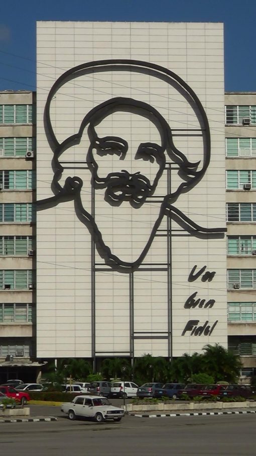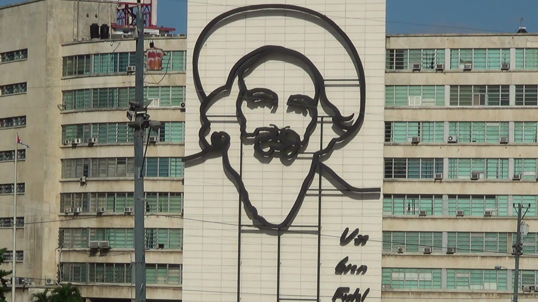 Plaza de la Revolucion. The Camilo Cienfuegos portrait on the wall of the Ministry of Information.