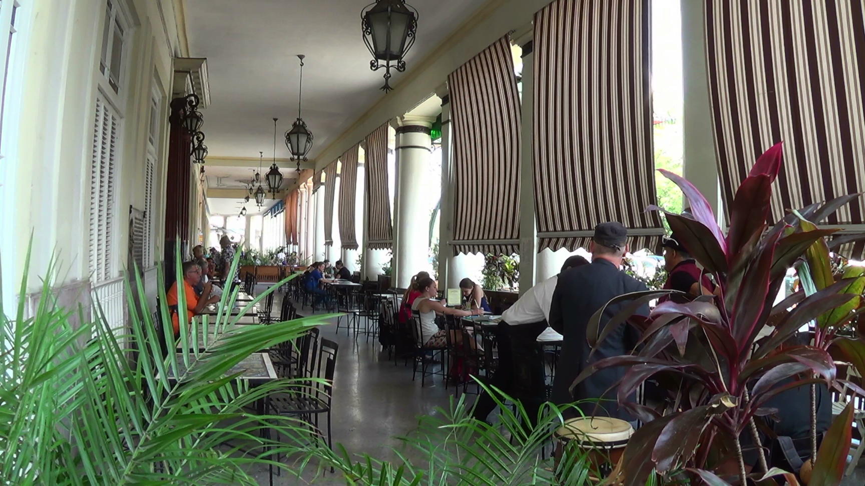 On the corner Boulevard de San Rafael / Paseo de Marti, the area in front of the Inglaterra. Musicians prepare for the performance. This is a panorama from the right to the left.