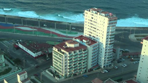 Evening on Malecon. A view from the Ecificio Focsa in Vedado, through the tinted window of the rooftop cocktail bar.
