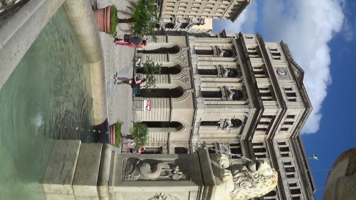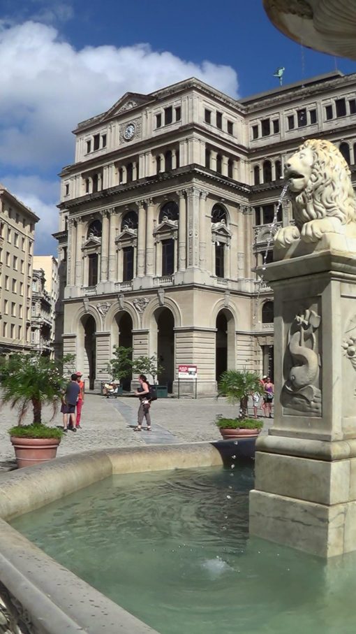 The Lions Fountain (Fuente de los Leones) on Plaza de San Francisco de Asis, La Habana Vieja. The former Havanna Stock Exchange in the background. La Habana Vieja is UNESCO World Cultural Heritage Site.