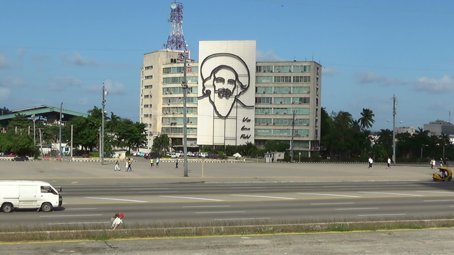Plaza de la Revolucion Jose Marti, the portrait of Ernesto Che Guevara on the Ministry of the Interior, the portrait of Camilo Cienfuegos Gorriaran on the Ministry of Information. This is a panorama from the left to the right, taken from the Jose Marti Memorial. This video is closer to the objects than the video clip no. 02954.