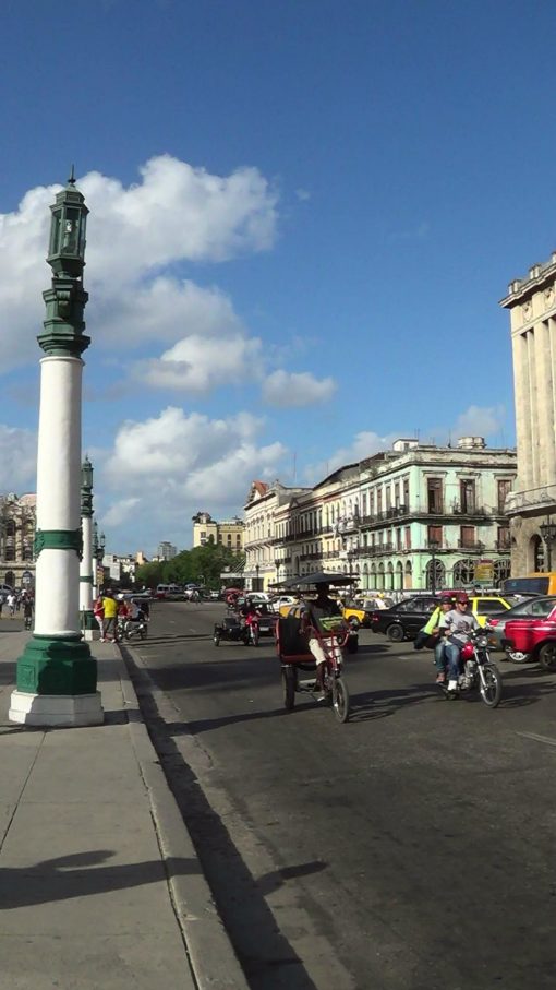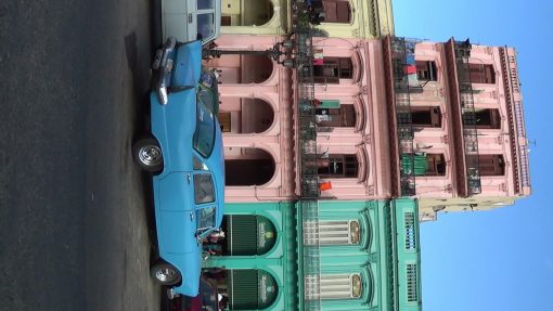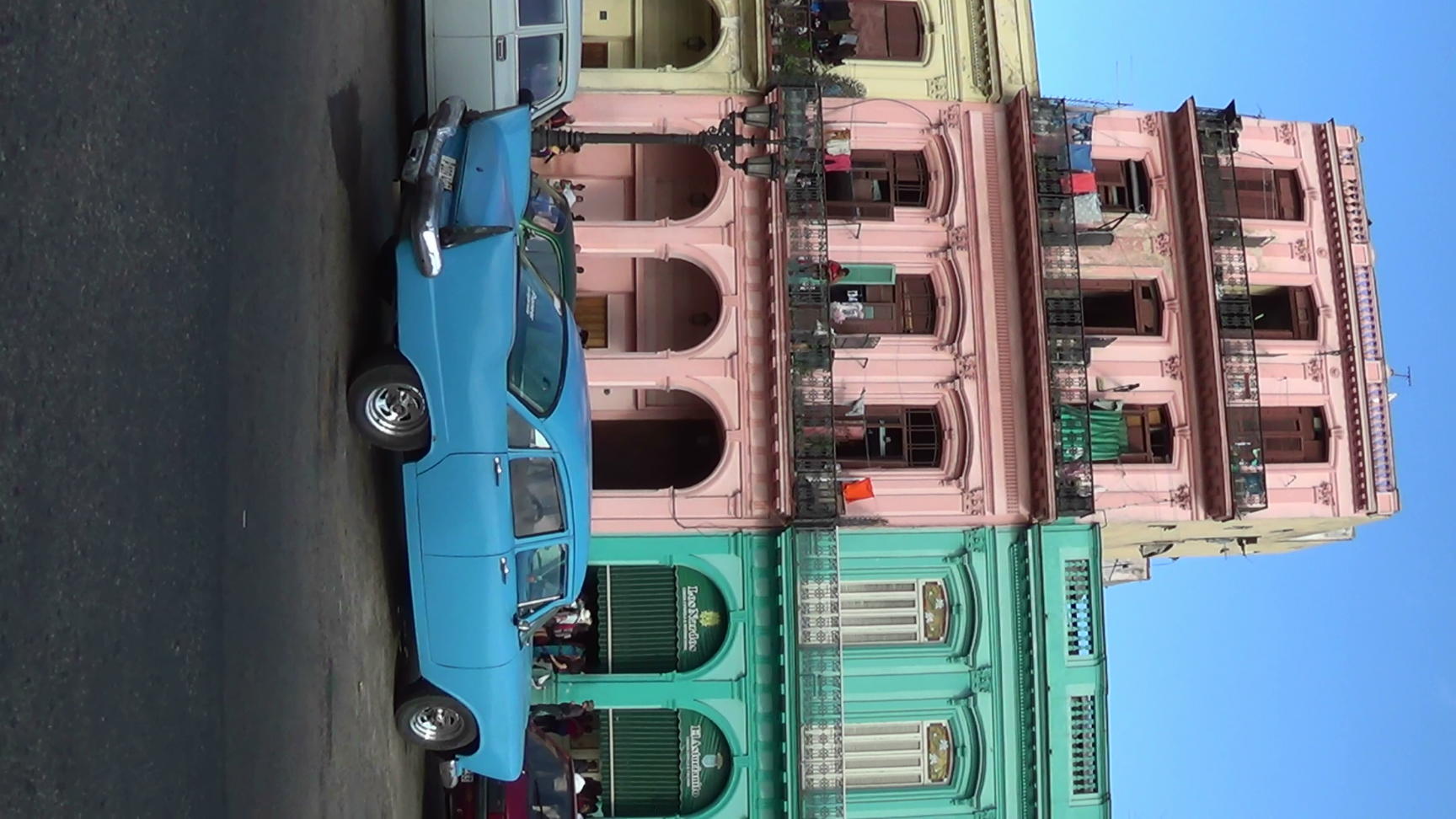 Street scene on Paseo de Marti (formerly Prado) in front of the Capitolio, with the Hotel Saratoga at the end of the video. The Old Town of Havanna (La Habana Vieja) is UNESCO World Cultural Heritage Site. This is a panorama from the left to the right.