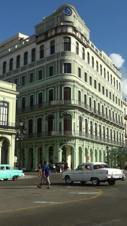 Street life on Paseo de Marti (formerly Prado), with the Hotel Saratoga across the street. The old town of Havanna (La Habana Vieja) is UNESCO World Cultural Heritage Site. The Capitolio is behind the camera. This view is closer to the hotel than the video clip no. 11757-2.