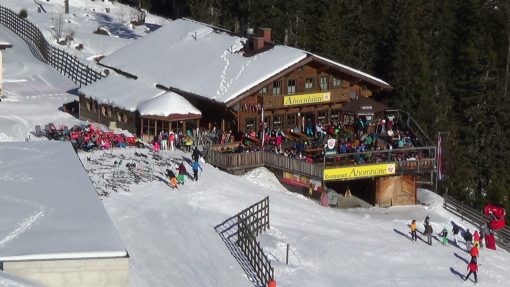 Skiing in the mountains of Salzburger Land. A typical mountain hut at the slope in Gasteinertal (Gasteiner Valley). This take is closer to the object than the video clip no. 30013.