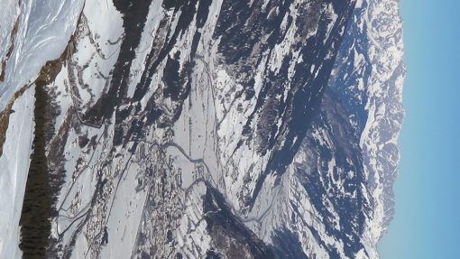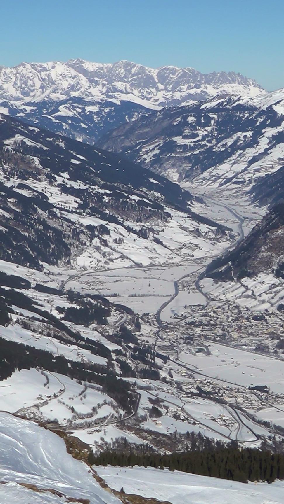 Winter in the mountains of Salzburger Land, view down to Gasteinertal (Gasteiner Valley). This is a panorama from the right to the left.