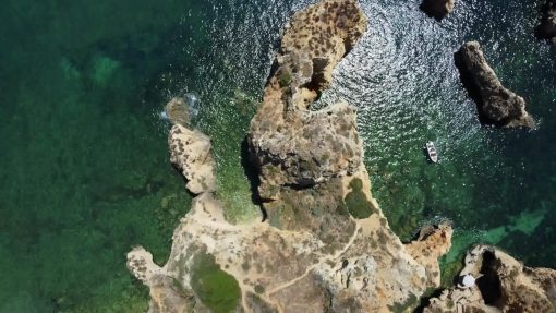 The jagged “swiss cheese” cliffs on the south coast (Algarve) to the atlantic ocean. This is Ponta da Piedade. Drone flight, landscape and sea move from bottom to top.