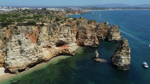 The jagged “swiss cheese” cliffs on the south coast (Algarve) to the atlantic ocean. This is Ponta da Piedade, the city of Lagos in the distance. Drone flight forward.