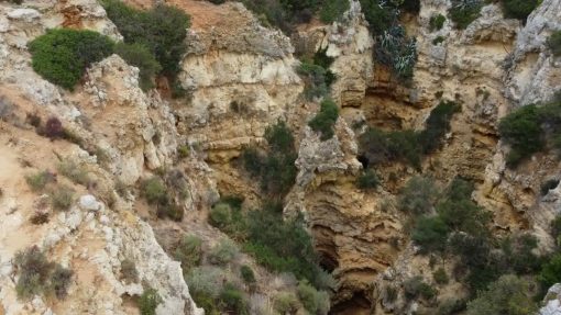 葡萄牙拉各斯。南海岸(阿尔加维)到大西洋的“瑞士奶酪”悬崖。这是蓬塔达皮达德。无人机向前飞行。