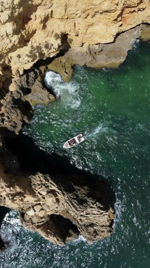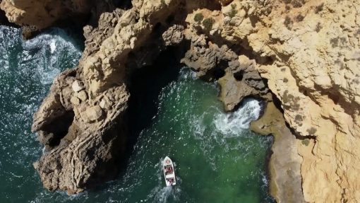 The jagged “swiss cheese” cliffs on the south coast (Algarve) to the atlantic ocean. This is Ponta da Piedade. Drone flight, the landscape moves from the right to the left.