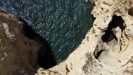The jagged “swiss cheese” cliffs on the south coast (Algarve) to the atlantic ocean. This is Ponta da Piedade. Drone flight. The landscape moves from the left to the right.