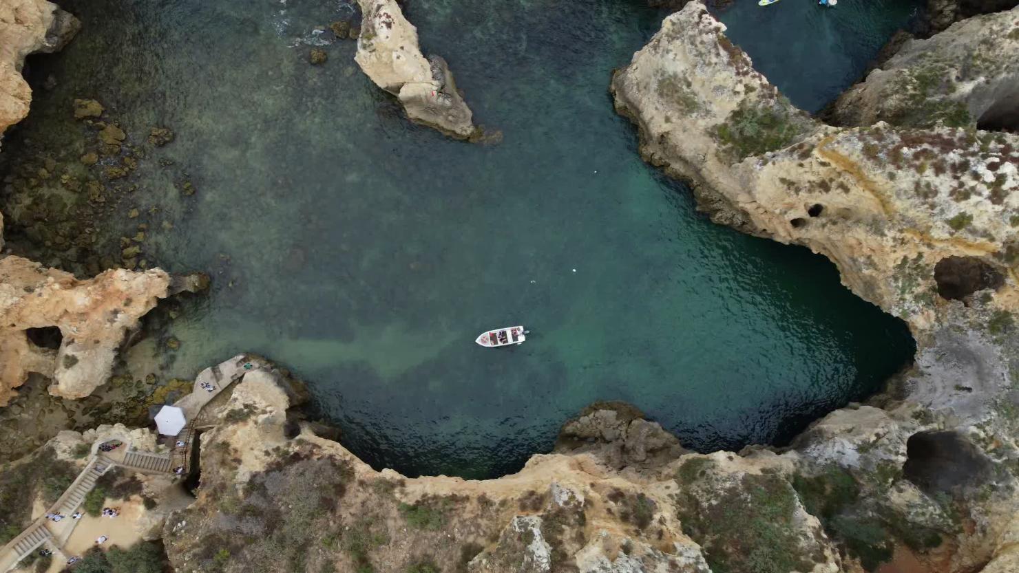 The jagged “swiss cheese” cliffs on the south coast (Algarve) to the atlantic ocean. This is Ponta da Piedade. Drone flight.