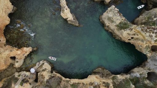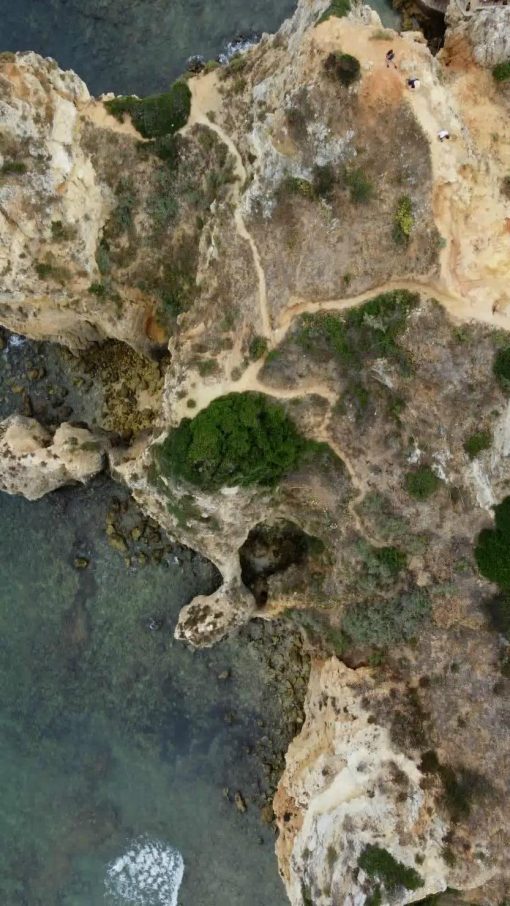 The jagged “swiss cheese” cliffs on the south coast (Algarve) to the atlantic ocean. This is Ponta da Piedade. Drone flight, the landscape moves from bottom to top.