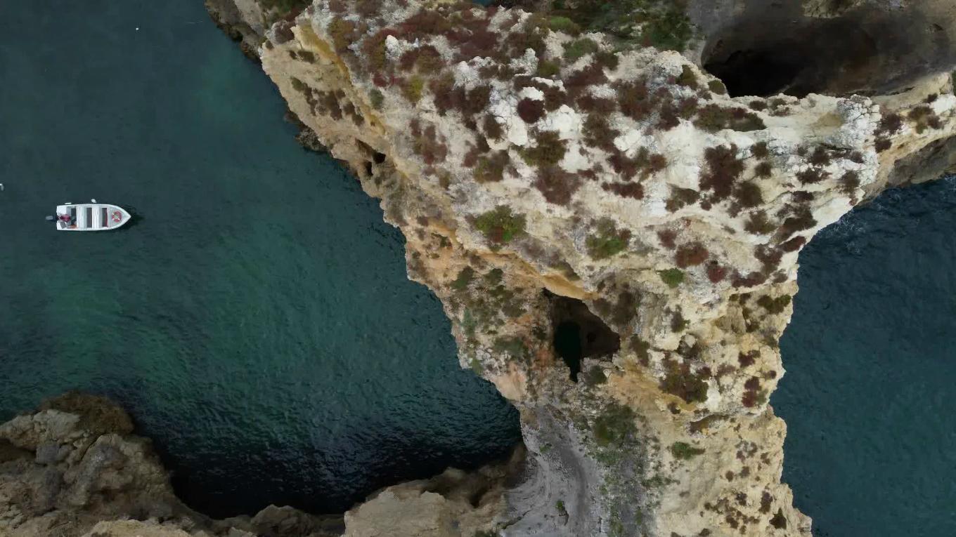 The jagged “swiss cheese” cliffs on the south coast (Algarve) to the atlantic ocean. This is Ponta da Piedade with a boat. Drone flight, the landscape moves from top to bottom.