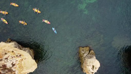 The jagged “swiss cheese” cliffs on the south coast of Portugal. Ponta da Piedade with kayaks. Drone flight.