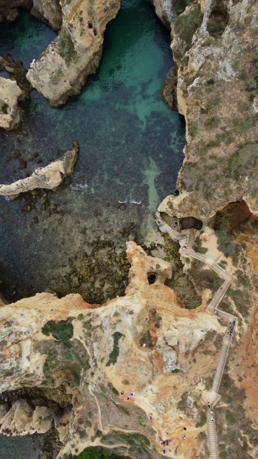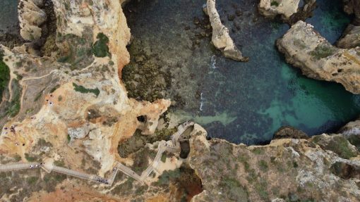The jagged “swiss cheese” cliffs on the south coast (Algarve) to the atlantic ocean. This is Ponta da Piedade. Drone flight, the landscape moves from left to right.