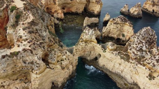 The jagged “swiss cheese” cliffs on the south coast (Algarve) to the atlantic ocean. This is Ponta da Piedade. Drone flight backward.